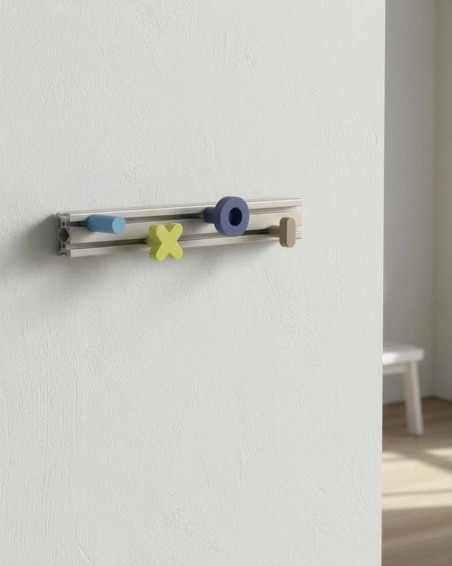 "After the first ideation rounds, I made some early 3D-printed prototypes before diving deeper into render visualizations. Testing proportions, attachment logic, and the character of the hooks on real aluminium profiles."